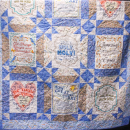As a church organist, I knew I had to make this quilt. One of my favorites, "Holy, Holy, Holy" is on the quilt. I remember leaning against my mom as a little girl in church and before I could read, I would listen to her and wait to join her when she would sing the chorus.